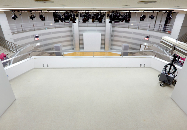 舞台や椅子が床面に収納できる円形ホールです。講演会、ピアノの発表会、映画の上映会など、幅広い用途にご利用いただけます。 お子様と一緒に利用できる親子室もあります。ピアノはスタインウェイ社製です。